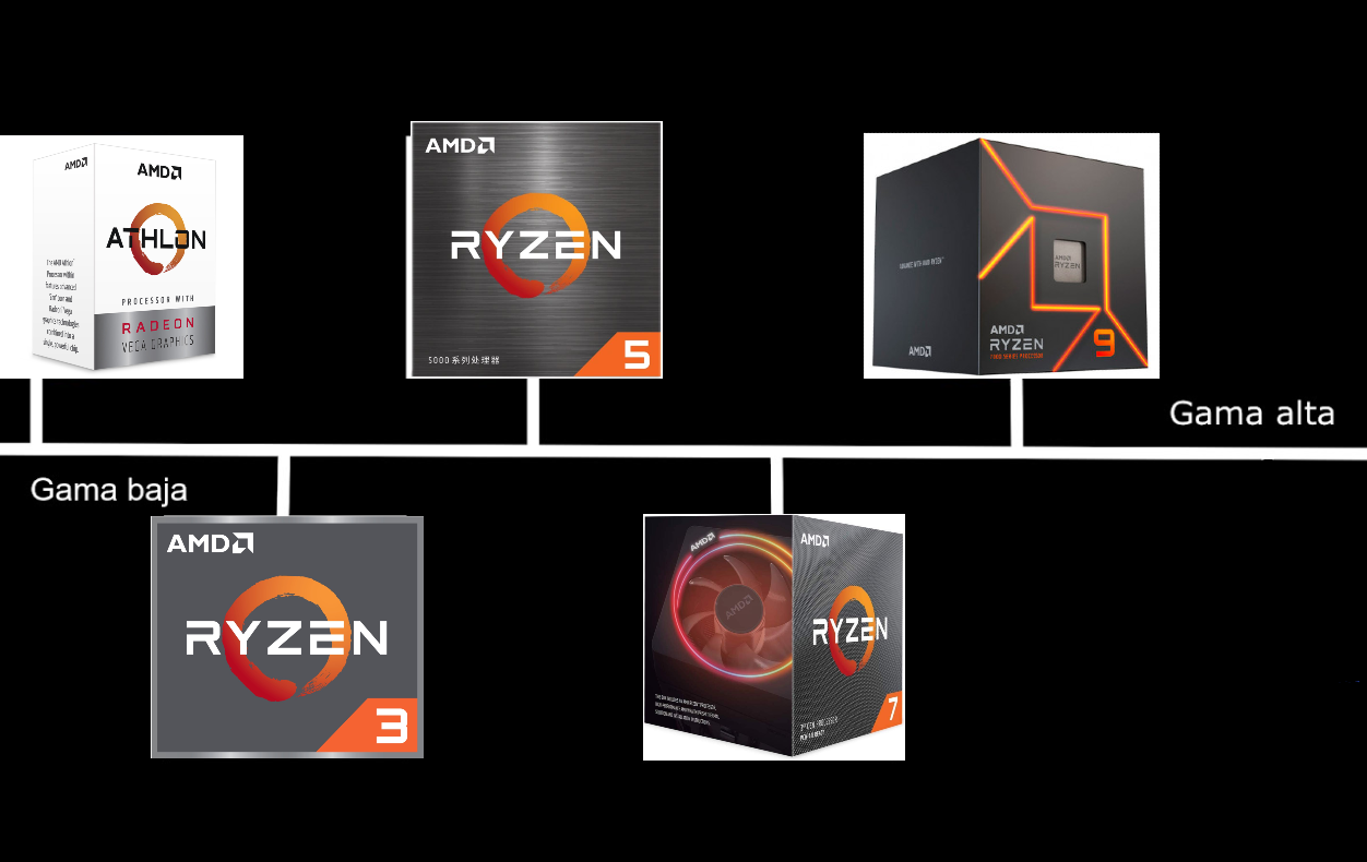 - A la izquierda tenemos la familia Athlon, de gama de entrada para uso ligero, con dos núcleos y cuatro hilos normalmente. Dentro de los Athlon están los Silver y los Gold (al igual que con los Pentium). Los procesadores Athlon actuales se basan en la arquitectura Zen con gráficos integrados Radeon Vega. Aunque se siguen vendiendo a día de hoy, es muy raro verlos y no tienen ningún sitio en el mercado, habiendo muchas alternativas por el mimso coste. - Los procesadores Ryzen 3 actuales se basan en la arquitectura Zen con cuatro núcleos y ocho hilos y están diseñadas para ofrecer un rendimiento sólido en tareas cotidianas como navegación web, correo electrónico, edición de documentos y reproducción de contenido multimedia - Los Ryzen 5 vienen a competir con los Intel Core i5. La mayoría de los procesadores Ryzen 5 tienen seis núcleos y doce hilos, lo que los hace ideales para jugar e incluso tareas de productividad más pesadas. - La mayoría de los procesadores Ryzen 7 tienen ocho núcleos y dieciséis hilos, con los que podremos realizar multitarea o virtualización de forma más rápida, además de una mayor potencia en juegos y demás. - Los procesadores Ryzen 9 de AMD son potentes unidades de procesamiento que han capturado la atención de entusiastas y profesionales gracias a su rendimiento excepcional. Los Ryzen 9 están diseñados para ofrecer un rendimiento de gama alta en tareas intensivas, como la edición de video, el diseño gráfico y la transmisión en vivo. Con núcleos de procesamiento que van desde 12 hasta 16, son opciones atractivas para aquellos que buscan un rendimiento excepcional en aplicaciones intensivas y desean aprovechar las últimas innovaciones tecnológicas en el mundo de los procesadores de escritorio. |