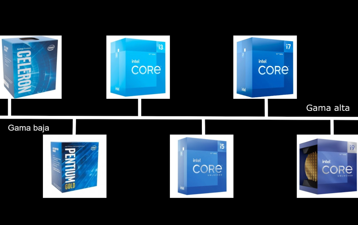 Si quieres investigar sobre la empresa y su trasfondo aquí te dejo un enlace a la hermosa Wikipedia, por que aquí voy a hablarte de lo que interesa, por lo que has entrado. Intel tiene una gama de procesadores muy extensa de la que te voy a hablar (en todos los puntos de más abajo me voy a referir a los procesadores de 12a generación). Es muy importante saber que en su duodécima generación se implementa una arquitectura híbrida en la que hay dos tipos diferentes de núcleos, P-cores (núcleos de rendimiento) y E-cores (núcleos de eficiencia). Los P-cores vienen a ser los que hemos tenido ahora, pero los eficientes son núcleos que se encargan de tareas menos importantes para liberar carga a los núcleos principales. Vale, ahora al tema, como puedes ver en este gráfico de la derecha hecho un poco rápido, hay cinco tipos de procesadores de Intel, que se pueden resumir en gama baja (celeron, pentium e i3), gama media (i5 e i7) y gama alta (i9). |