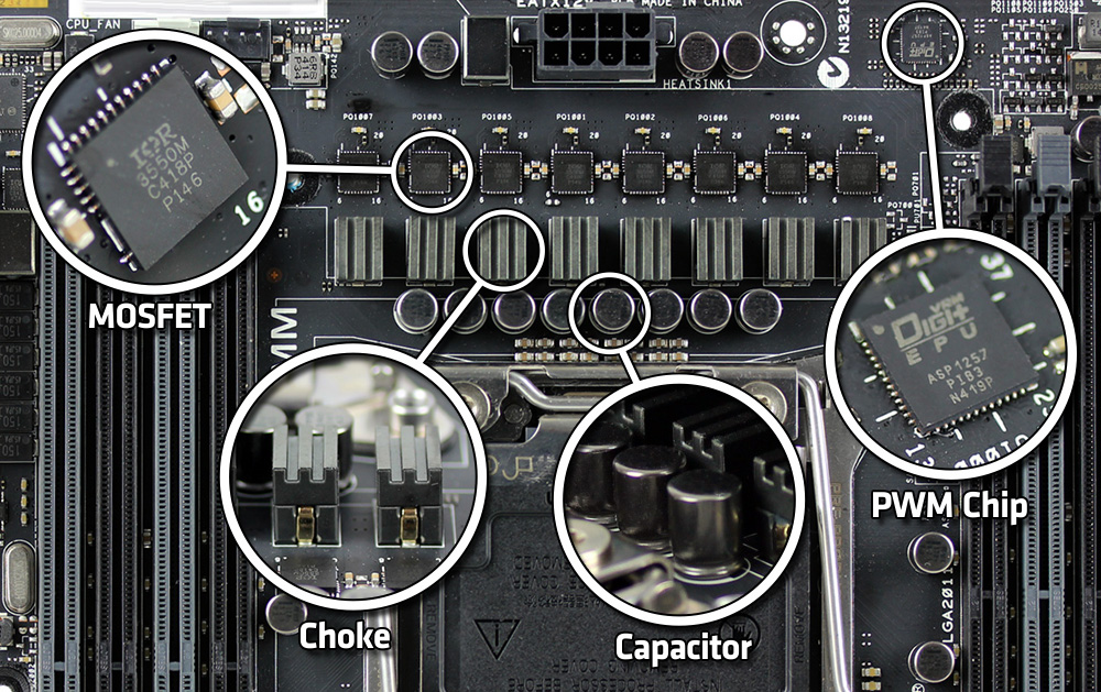 EL VRM es el regulador de voltaje, presente en prácticamente cualquier aparato electrónico. Como su nombre indica, se encarga de dar el voltaje correcto de forma estable y sin interrupciones. En un PC lo podemos ver principalmente en la GPU y en la placa base, alrededor de la CPU. El VRM se conforma de cinco partes: - el condensador, que son esa especie de tubos grises - los mosfets, que son los chips que suelen estar al lado de los condensadores - los controladores PWM, otro chip más pequeño - los chokes, una pieza de metal con una especie de muesca en medio |